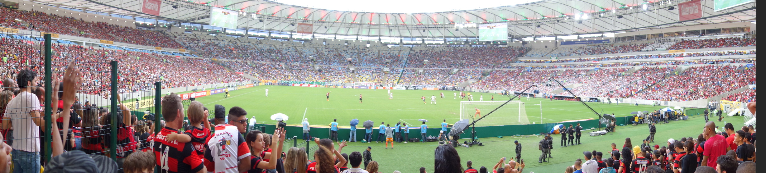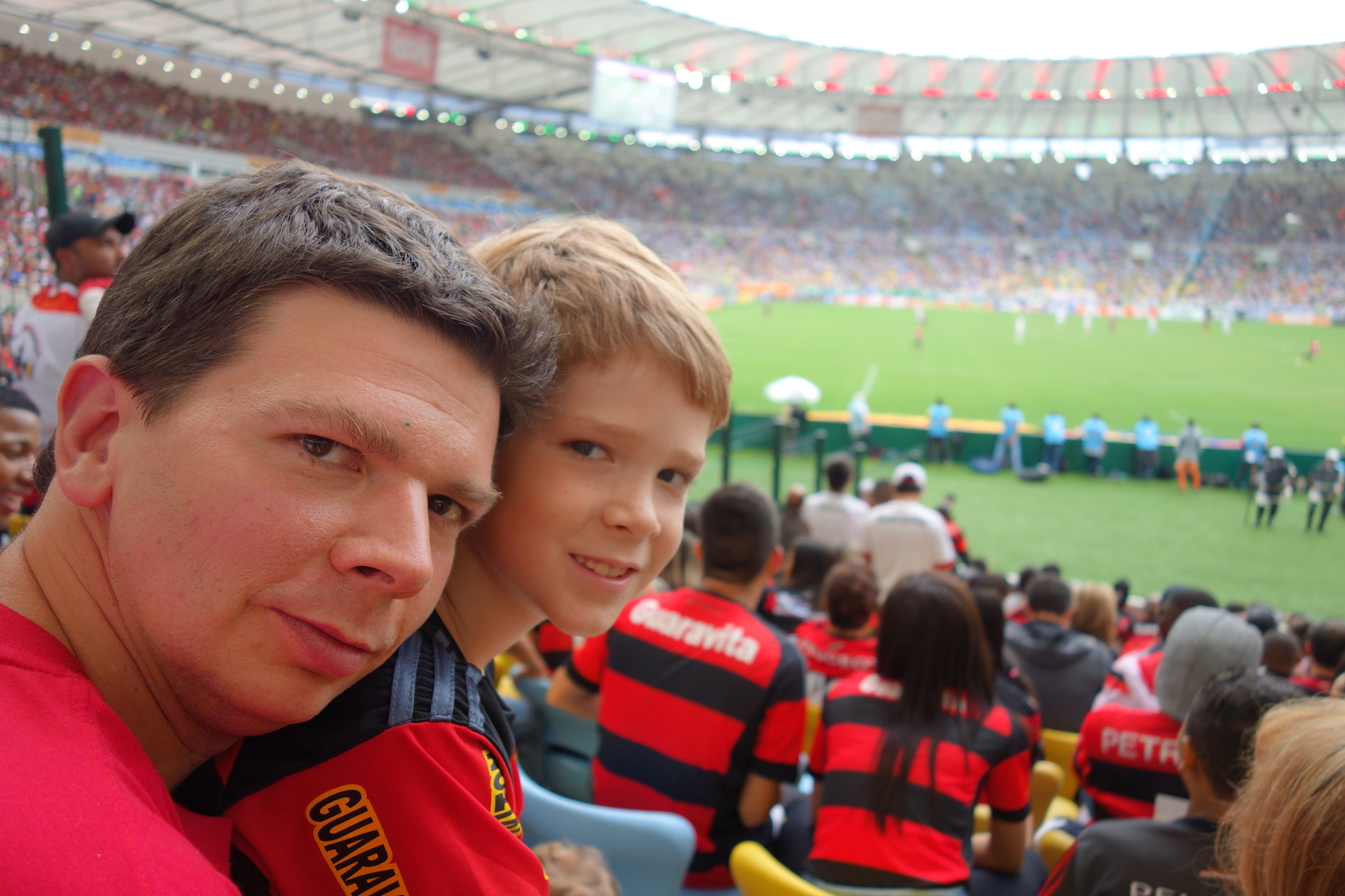 Avant hier : Montagne du Corcovado, pour y voir admirer le Christ Rédempteur, construit en 1922 pour votre culture. Hier : Quartier Santa Teresa, soit le Montmartre Brésilien et aujourd’hui : match de foot au mythique stade du Maracana ! Quelle ambiance incroyable ! Ici, on vient voir le match en famille, tous ensemble (Flamengo – Fluminences sont 2 équipes de Rio) : bébé, mamie, fauteuil roulant, poussette, béquilles, c’est pour tout le monde ! Le futbol fait partie de la culture brésilienne à un point insoupçonnable. Certains sont tatoués de l’écusson de leur équipe … moi, ça me dépasse. ça fait du bien au moral cette ferveur quand même.